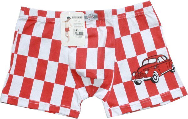 Dětské trenýrky pro děti, kluky, motiv šachovnice s potiskem auta. Celopložně i vzádu s velkým autem