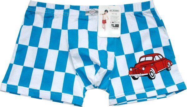 Dětské trenýrky pro děti, kluky, motiv šachovnice s potiskem auta. Celopložně i vzádu s velkým autem